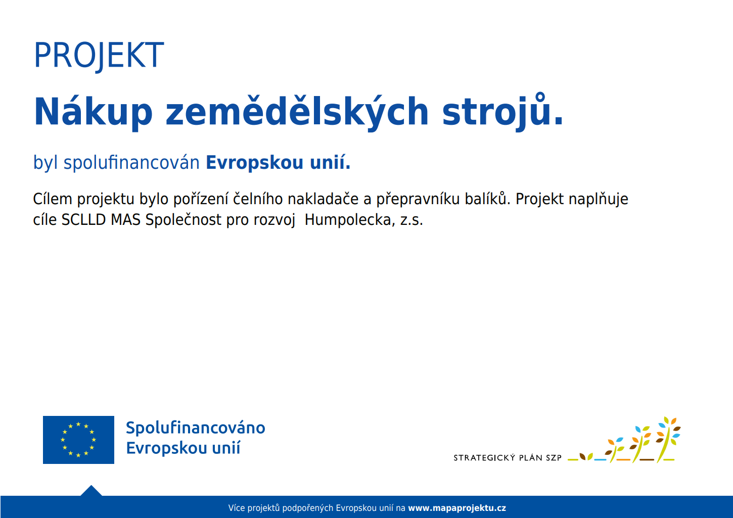 Tento projekt je spolufinancován Evropskou unií a byl realizován z 2. výzvy SP SZP MAS Společnost pro rozvoj Humpolecka, z.s. MAS děkujeme za odborné poradenství a pomoc při přípravě žádosti o dotaci. Díky vstřícnému a kvalitnímu poradenství se nám podařilo projekt úspěšně dokončit a výrazně tak zlepšit strojní vybavení našeho hospodářství.
